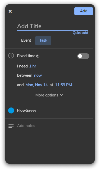 Since the very beginning of FlowSavvy, tasks have been automatically color coded (green / orange / red) based on how close they are scheduled to their due date, and all events were blue. Now, you’ll have the ability to choose your own colors!