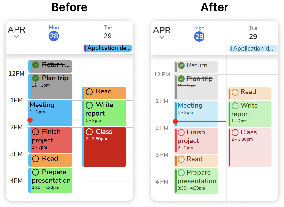 As part of the update, we removed the colored left border that previously indicated calendar color. While useful in theory, this design choice added visual clutter, especially when combined with custom event colors and smart task color coding, and didn’t fit well with the new design. Removing the border helps the schedule view feel simpler and more focused.