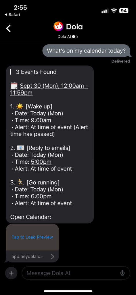 - Dola: An AI calendar assistant that allows users to manage events using natural language through messaging apps like WhatsApp and Apple Messages. You can interact with Dola using text, voice, or even images, making it a flexible solution.