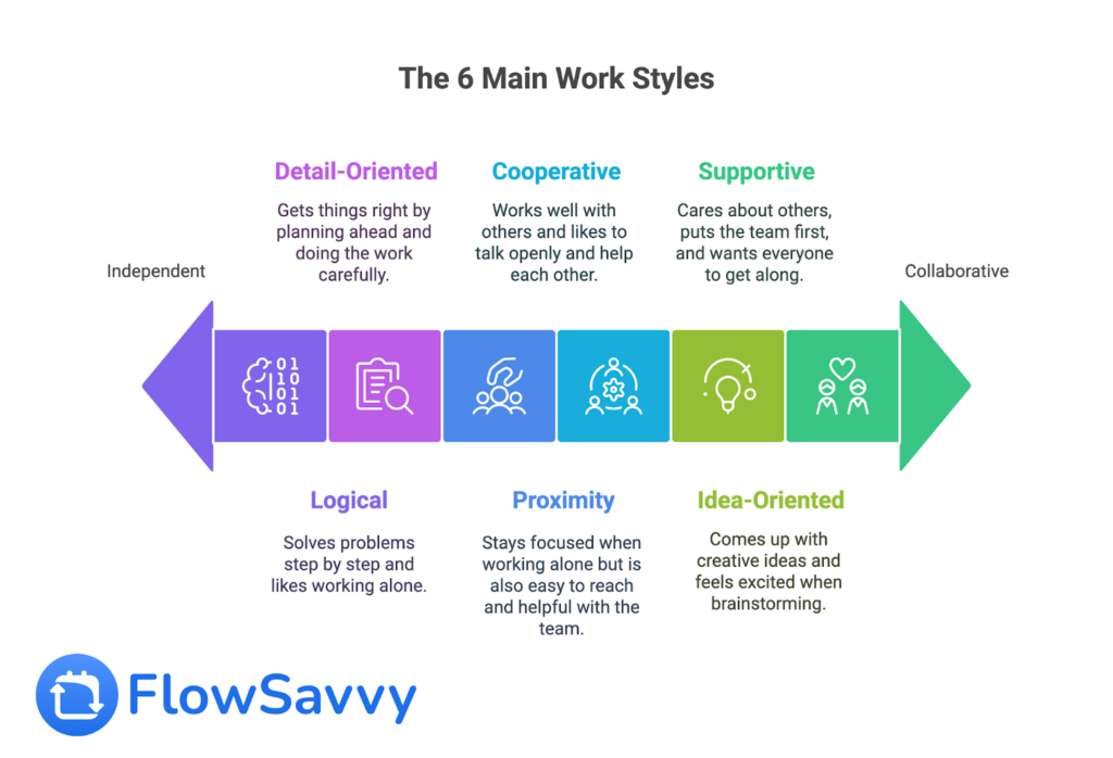 A work style is the way you prefer to get things done and how you interact with others at work. It includes how you solve problems, manage time, and handle tasks, both alone and in a team. Everyone has a different style, and that’s actually a good thing!