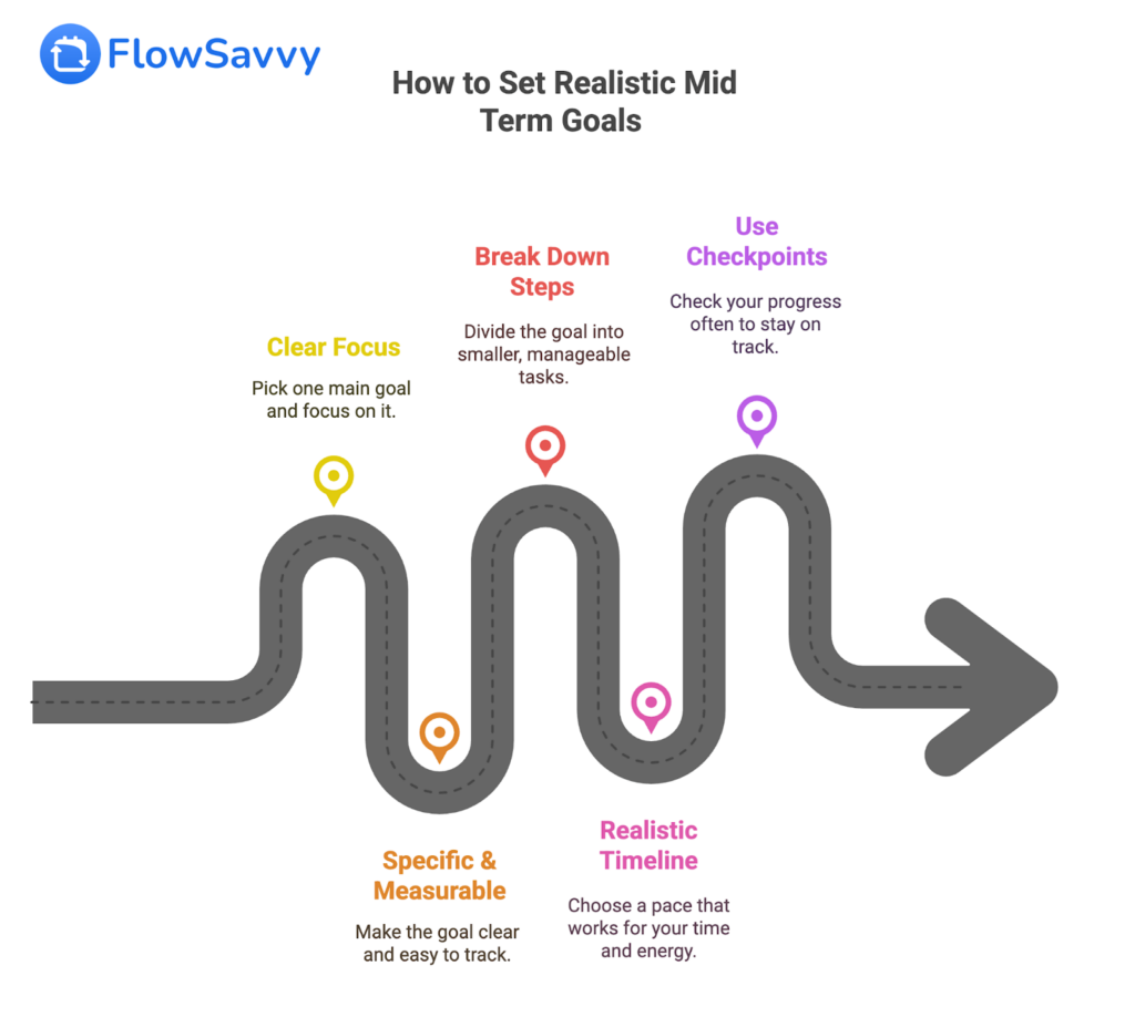 Mid term goals help you move forward without feeling rushed or burned out. The key is to start with one clear focus, break it into steps, and check in regularly. When your goal matches your pace and has room to adjust, it’s much easier to stick with.