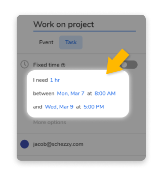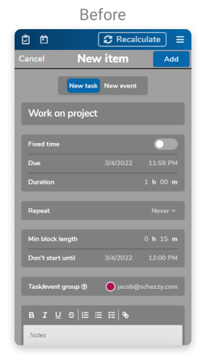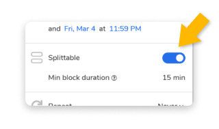 The all new “splittable” toggle makes it easy to tell FlowSavvy which tasks can be split up into smaller chunks (ex: work on a project) and which tasks need to be done in one block (ex: grocery shopping).