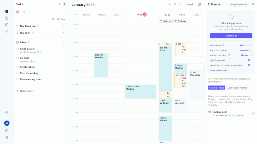 Morgen is best for people who like a lot of control in their planning but want some additional help from AI. While the AI scheduling doesn’t consider the entire schedule as holistically as the other options in this list, it is a great option for people who enjoy manual time blocking and want help planning faster with AI suggestions.