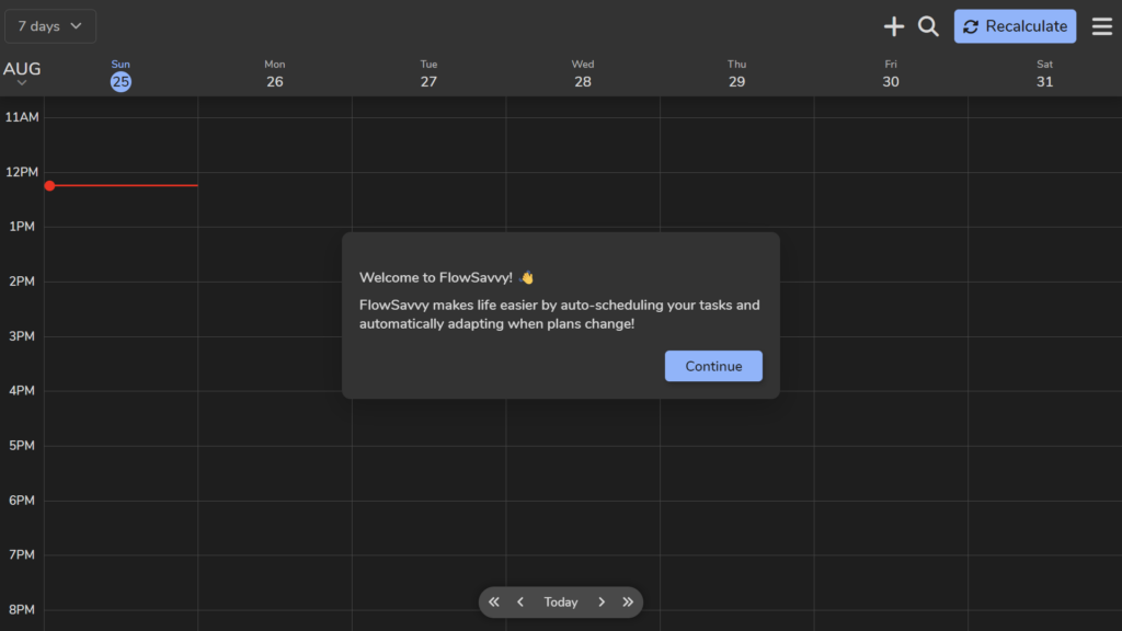 Plans can change at the last minute—meetings run over, or unexpected tasks pop up. Instead of manually rearranging everything, FlowSavvy allows you to reschedule your entire day with just one click. Simply hit “Recalculate,” and FlowSavvy will instantly recalculate your optimal schedule, giving you a fresh start whenever you need it. This way, even if your day doesn’t go as planned, you can always get back on track without feeling overwhelmed.