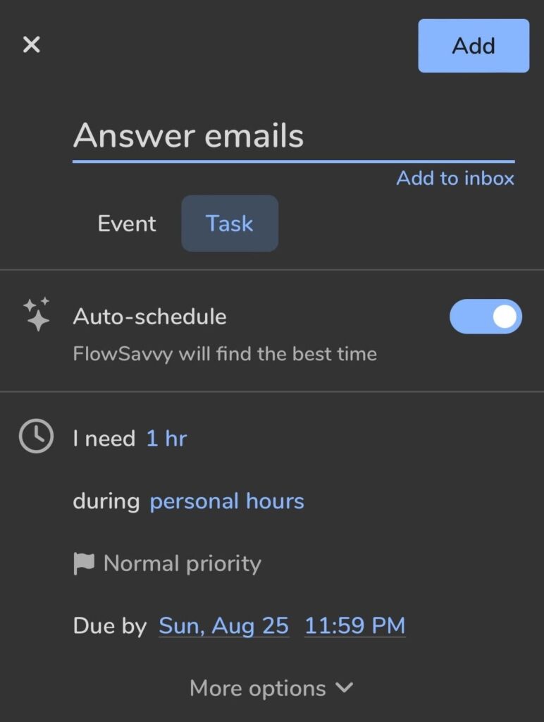 If you don’t have time to enter all the details of a task, use FlowSavvy’s inbox feature to capture it quickly. Later, you can go back, fill in the necessary details, and let FlowSavvy schedule it. This is a great way to jot down tasks as they come to mind without interrupting your current workflow.